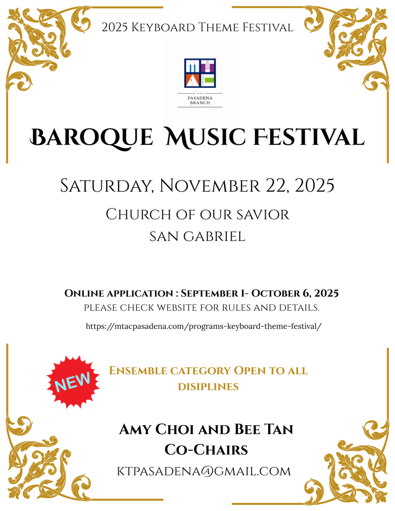 - For the ensemble category, at least one ensemble member must study under an active member of MTAC Pasadena Branch.
